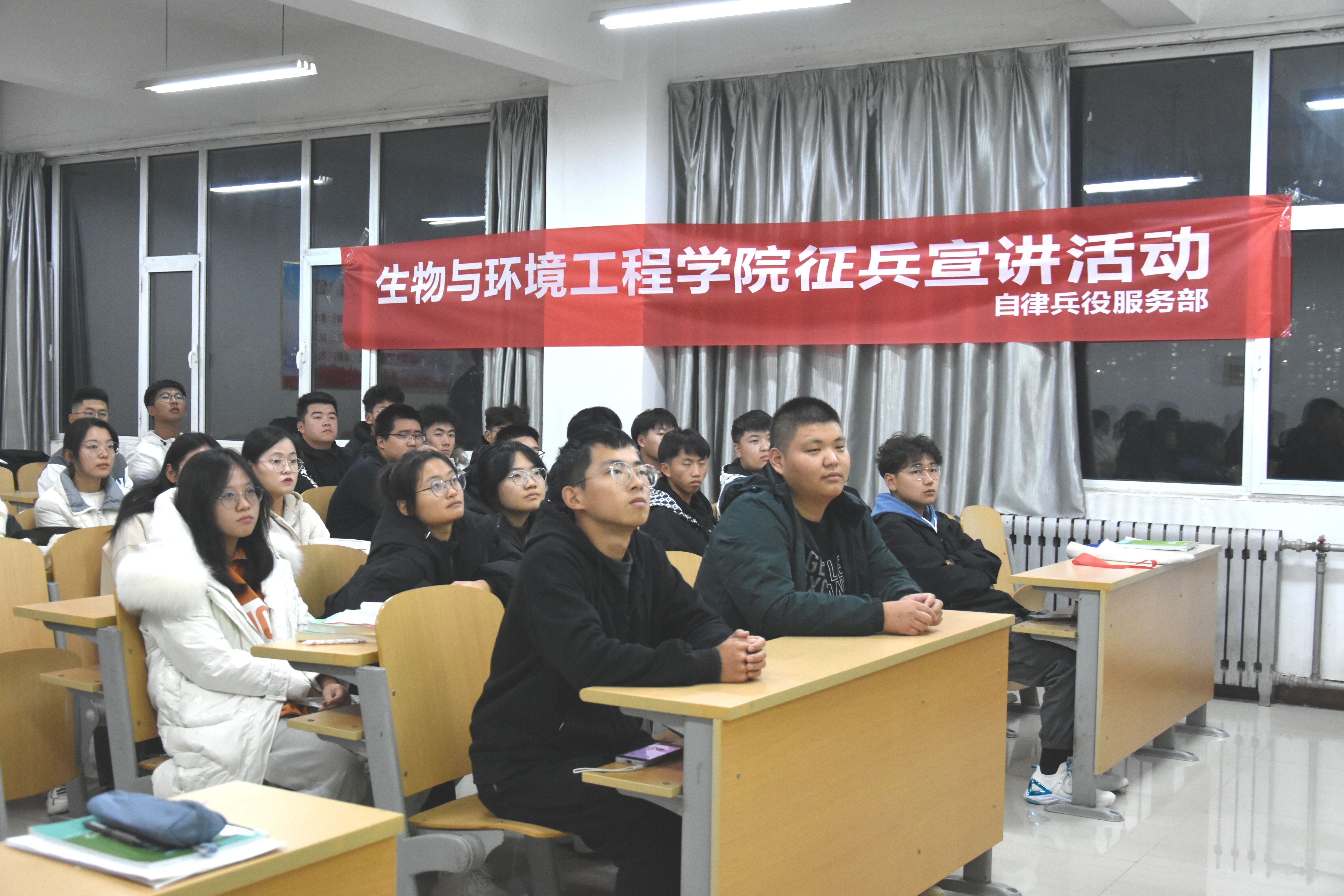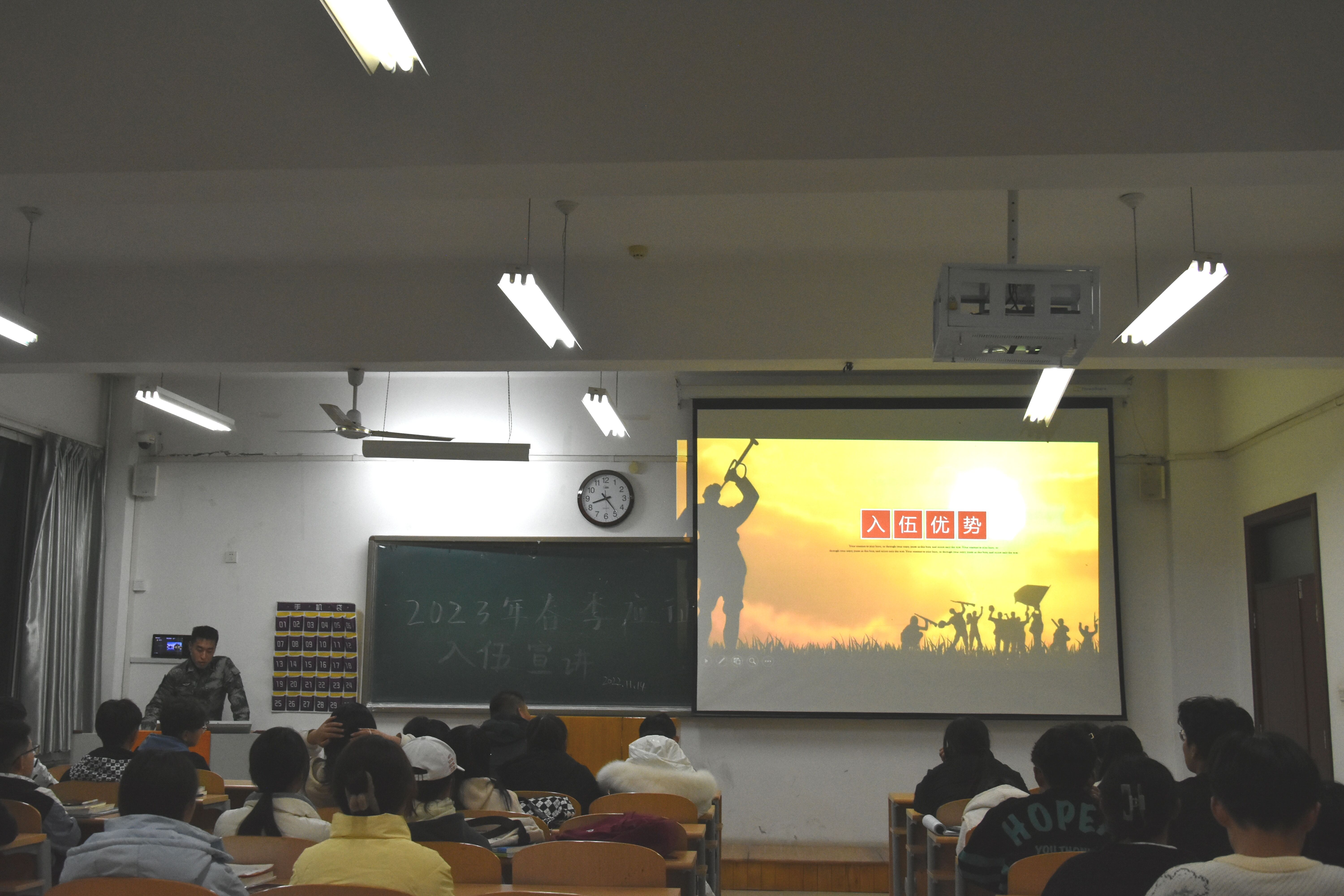 为进一步激发大学生的参军热情、做好征兵入伍宣传动员工作,推进国防和军队现代化建设。11月14日,生物与环境工程学院兵役服务部在八号教学楼504教室组织开展了“参军报国尽义务,热血青春效祖国”征兵宣讲活动。由退役复学学生王展一负责宣讲,22食品本1全体同学参加。