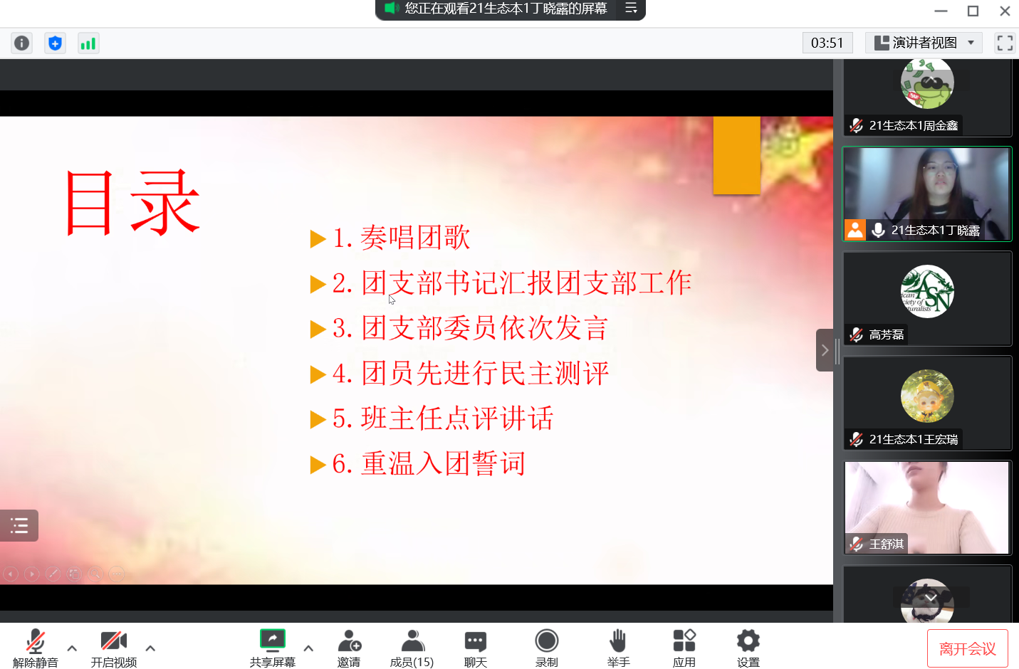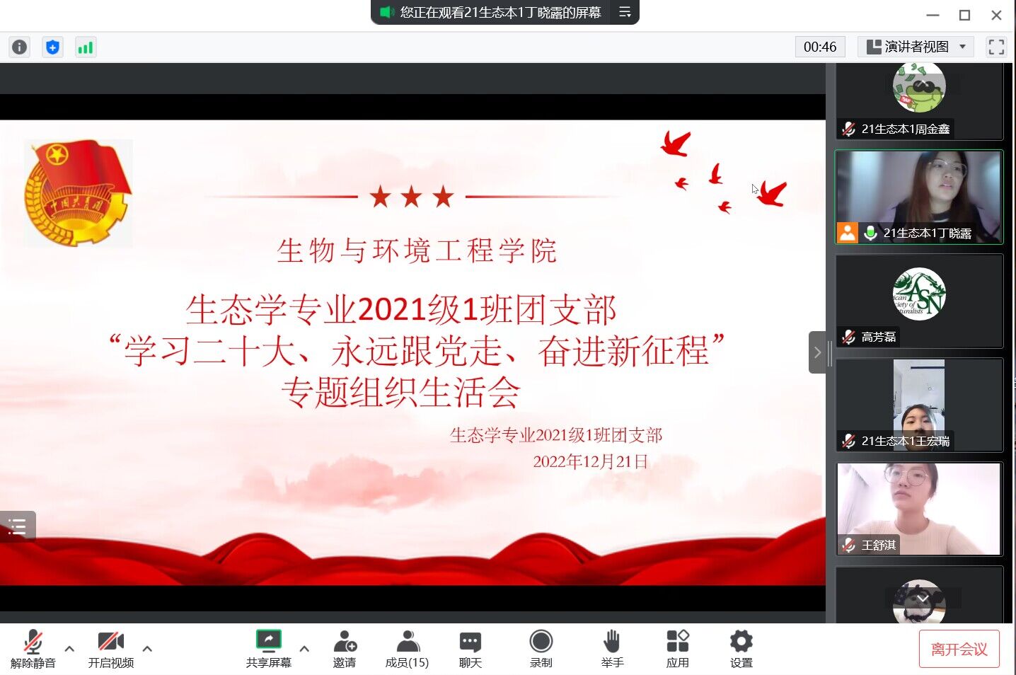 为进一步深化“学习党的二十大精神、永远跟党走、奋进新征程”主题教育,更好的学习与感受党的二十大精神,要深刻领悟“两个确立”的决定性意义,增强“四个意识”、学习“四个自信”、领会“两个维护”,用党的二十大精神指引学生学习工作发展。生态学专业2021级1班团支部于12月21日召开线上专题组织生活会。本次组织生活会由班主任高芳磊老师、生态学专业2021级1班团支部16名团员共同参加。