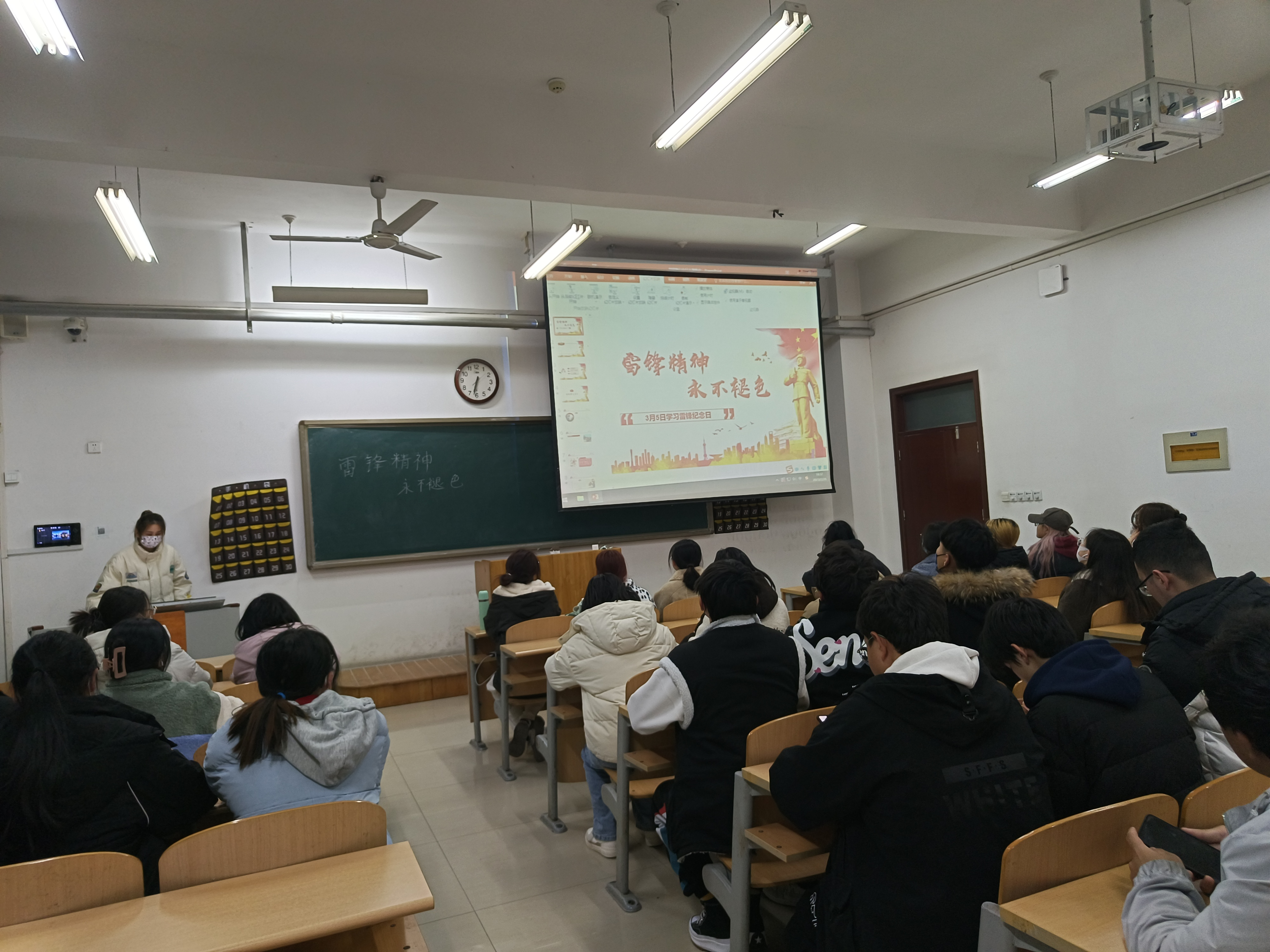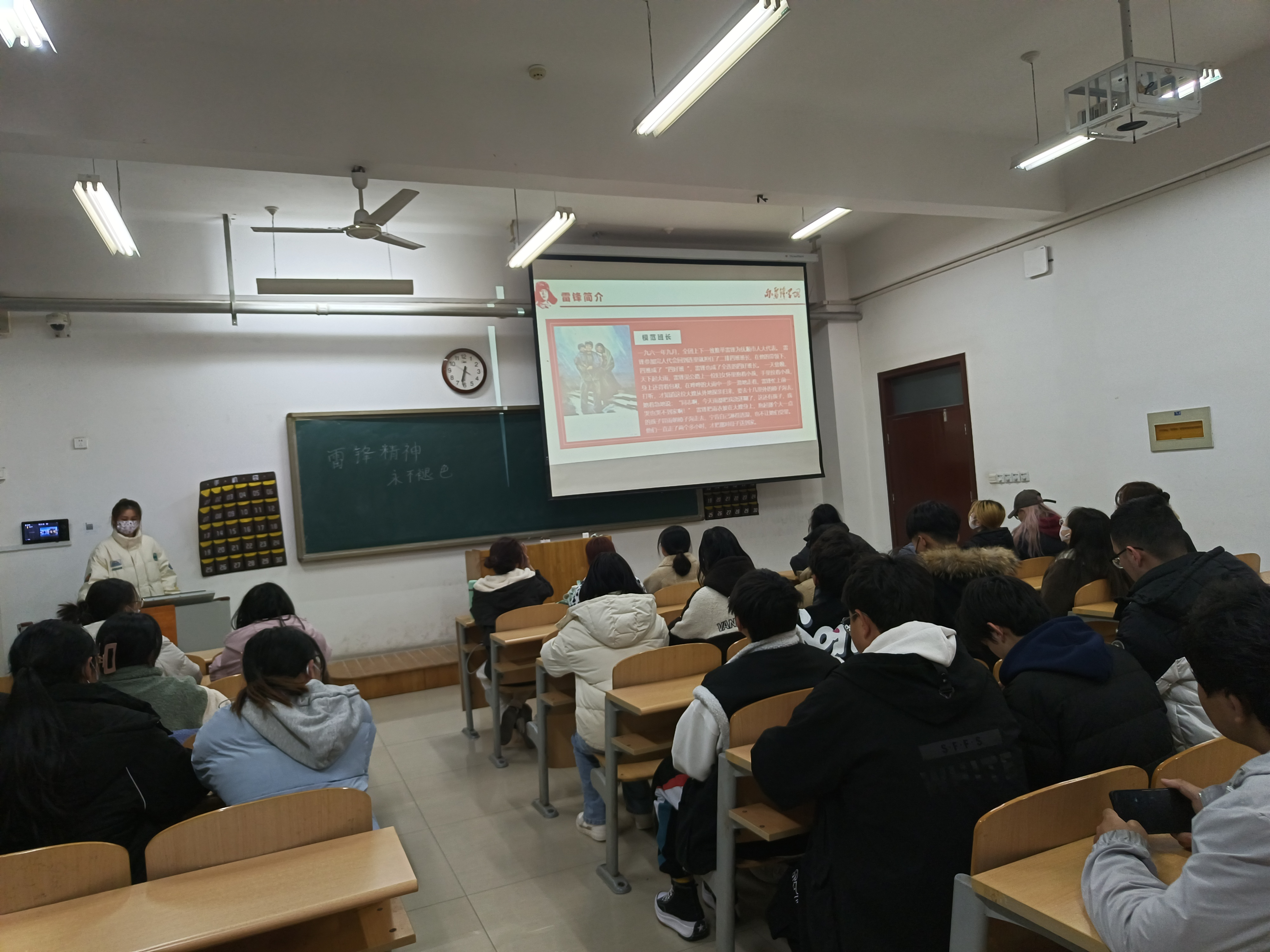 此次活动分为三部分。首先,团支书对雷锋的生平进行介绍,讲述雷锋同志的优秀事迹,让同学们对其优秀事迹有基本的了解;其次,选择雷锋日记中的部分内容进行讲解,让同学们思考雷锋精神并积极交流讨论,同学们积极分享自己对于雷锋精神的看法;最后,讲述雷锋精神的意义,让同学们认识到雷锋同志为共产主义而奋斗的无私奉献精神;忠于党和人民、舍己为公、大公无私的奉献精神;苦干实干、不计回报的敬业精神;在平凡的工作中创造出不平凡业绩的“螺丝钉精神”;全心全意为人民服务的助人精神;“一滴水”的团结精神;“一线光”的磊落精神,对雷锋精神进行了解析,解答了同学们的疑惑,鼓励同学们积极向雷锋同志学习,全心全意为人民服务,让雷锋精神的火焰不灭,代代相传。此次活动圆满结束。