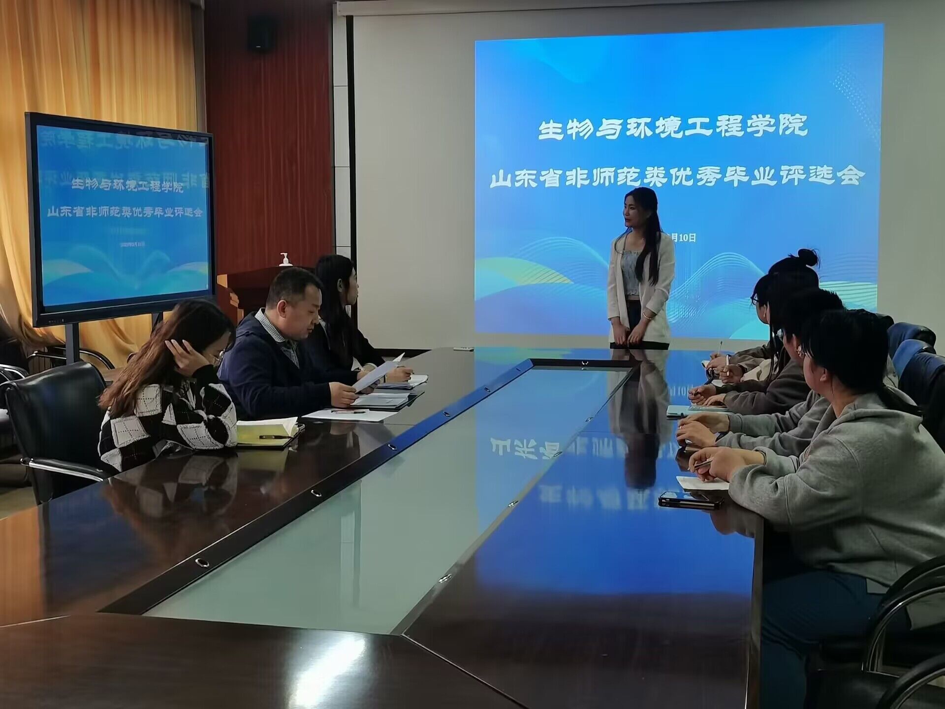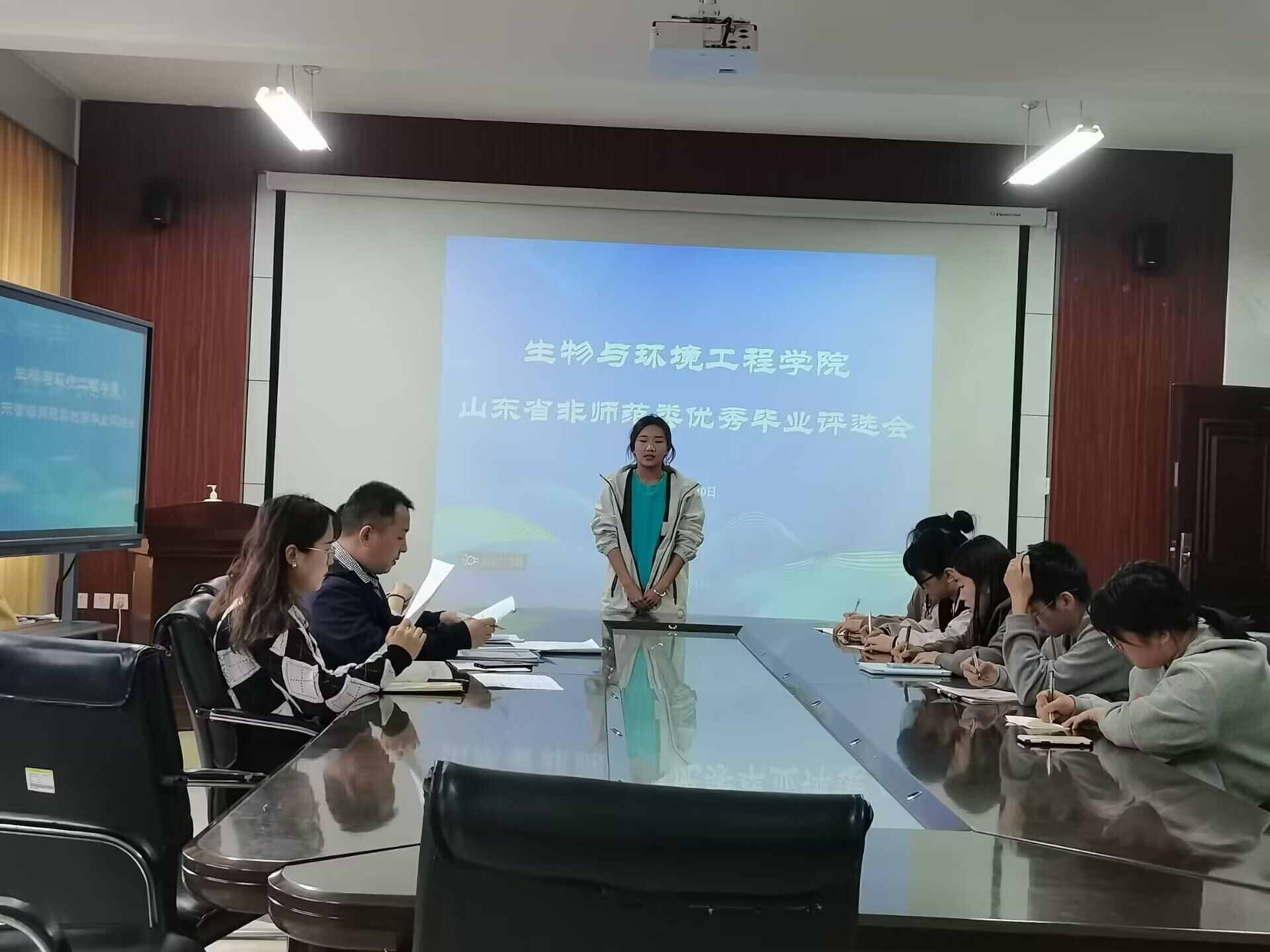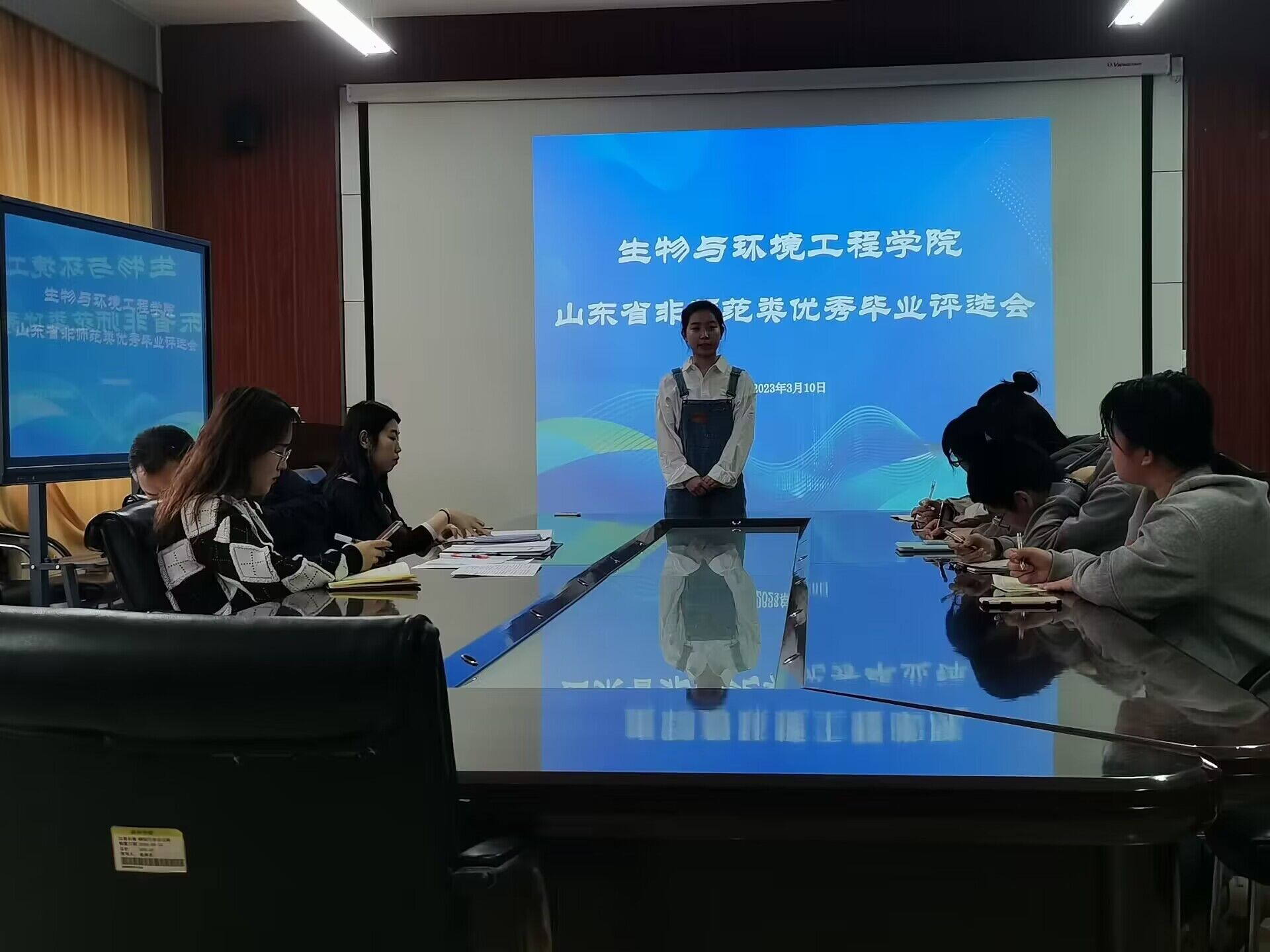 为做好我院2023届省级优秀毕业生推荐评审工作,打造学院与学生互促发展的强劲引擎,永葆滨院与生工自强不息,守正出奇的精神品质,3月10日,生物与环境工程学院于实验中心B7-230教室组织开展山东省优秀毕业生评选会。学生科科长赵望锋,辅导员史戈,周建芳,学生会主席团及自律辅导中心各部门学生代表参与评审,各位符合条件的意向毕业生参与竞选。