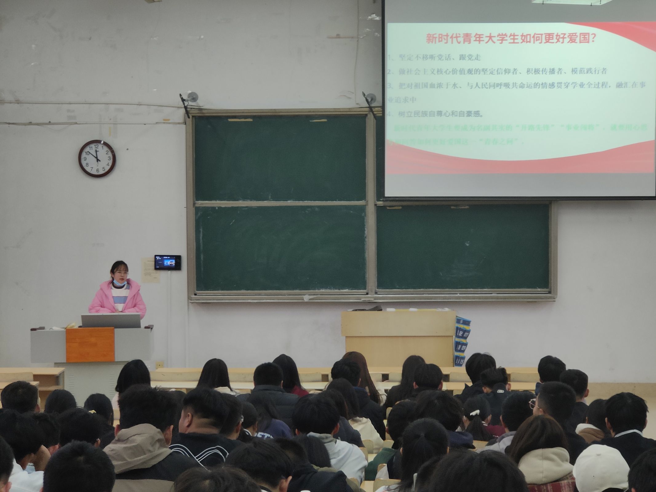 会议开始,史戈先强调身为践行社会主义核心价值观的时代新人,首先要做到热爱自己的国家,以国之务为己任,并说明身为滨院家庭中的一份子,要做到热爱滨院,了解滨院的荣誉历史。接着史戈表明,生物与环境工程学院曾多次获得优秀学院称号,累计承担多项教学改革项目等。生工拥有极高的考研率,其优秀的教学资源成就了无数生工学子追逐梦想的道路。我们更要做到热爱生工。最后史戈总结了上周的工作,重点强调身体健康问题,有异常时按流程寻求帮助,要从期末考试中吸取教训合理安排时间,劳逸结合。要一如既往的加强电信诈骗意识,不轻信陌生人,不主动汇款。同学们认真聆听,此次会议圆满结束。
