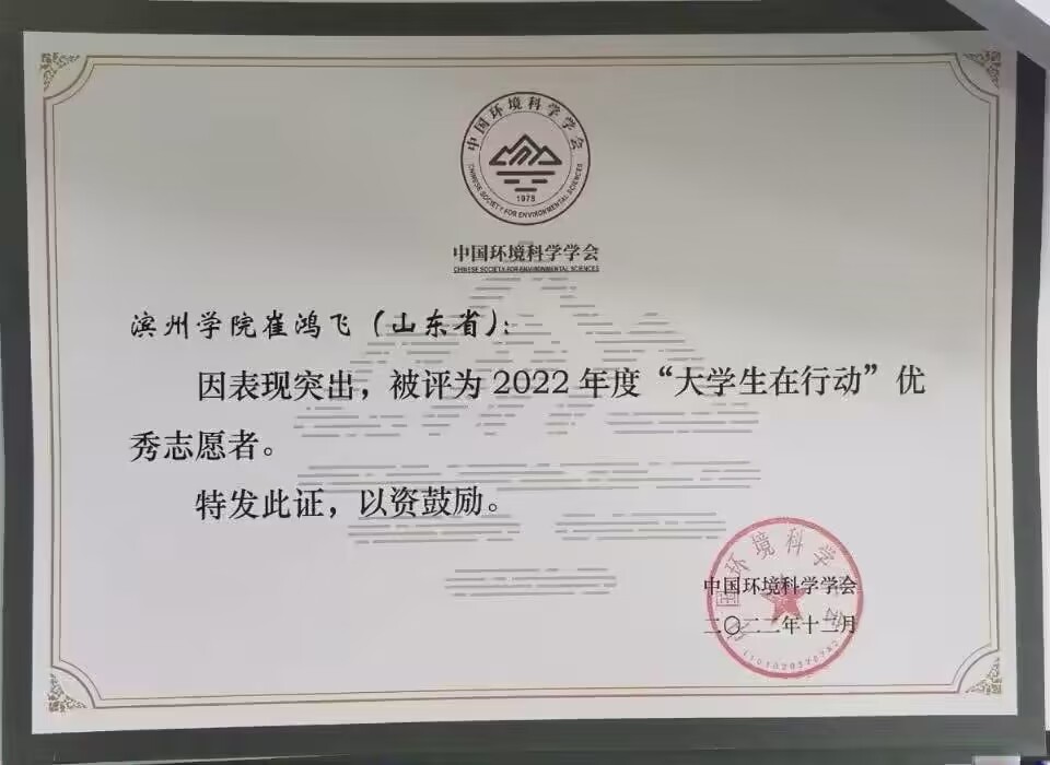 崔鸿飞同学就是服务队一名优秀的代表,她将自己满腔热情投入在志愿服务活动,希望能够以自己的力量去改善和保护环境。在2022年度的志愿服务活动中,崔鸿飞就因为在志愿服务队表现突出,积极参与,被中国环境科学学会评为了2022年度“大学生在行动”优秀志愿者。
