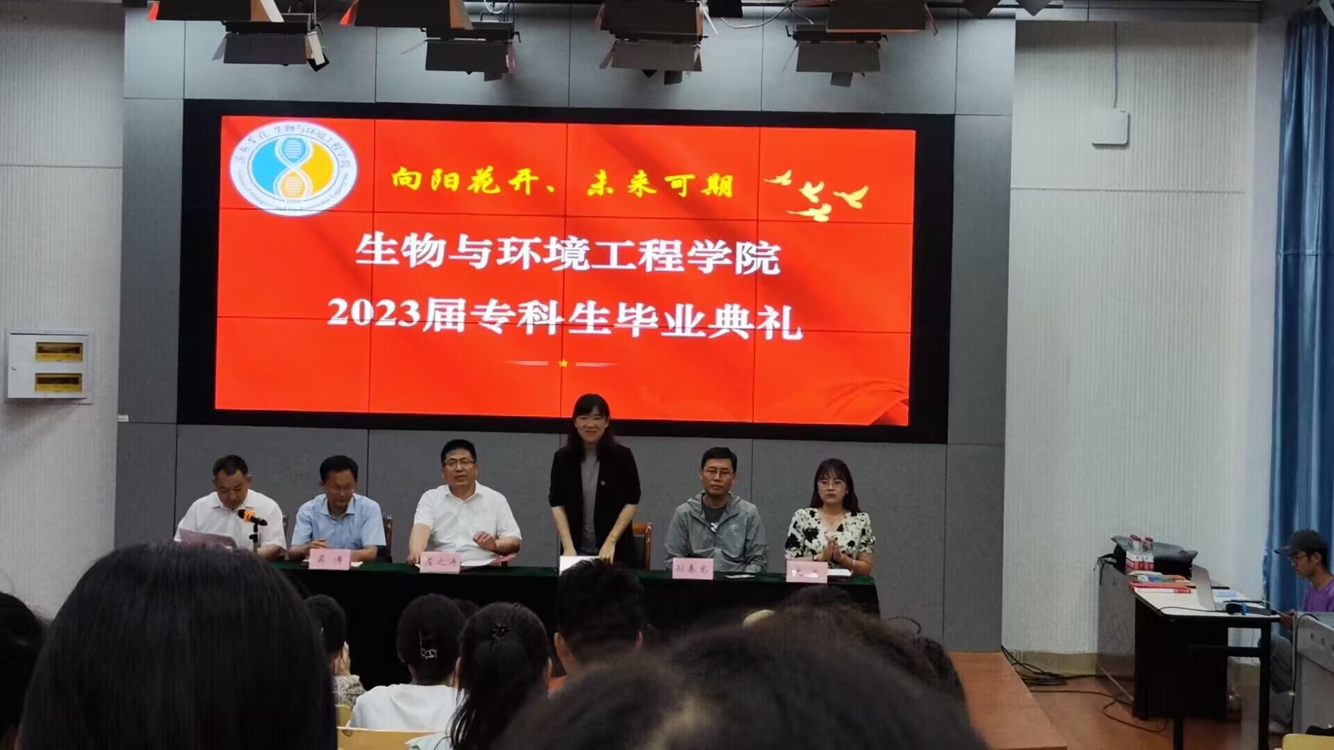 六月,是夏季正当时,也是青春散场,毕业在即。6月7日,生物与环境工程学院在4号教学楼106教室为2023届专科毕业生举办了毕业典礼。此次毕业典礼由团总支书记赵望锋主持,党总支书记左之涛、院长王君、副院长吴涛、孙春龙老师、辅导员史戈及20级药品生产技术全体学生参加。