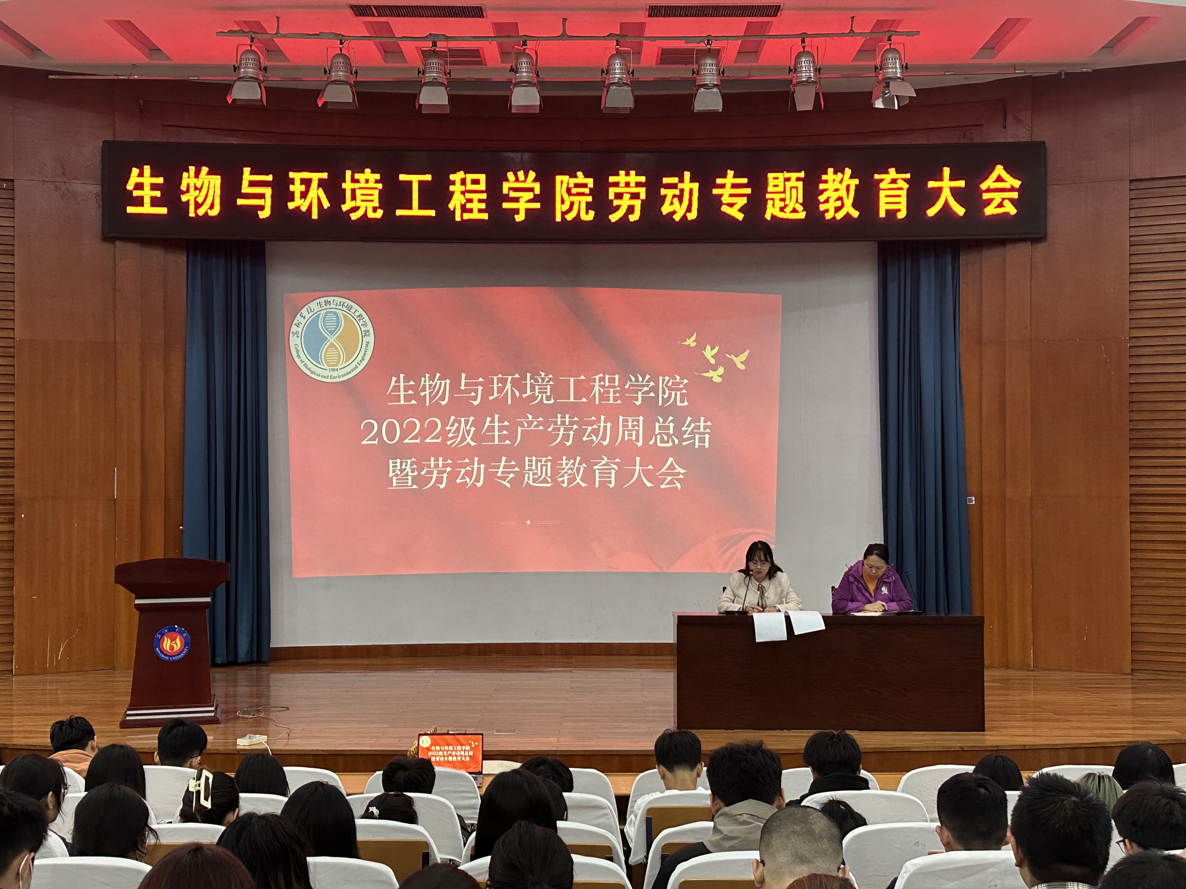 为深入学习宣传贯彻习近平总书记在党的二十大报告中强调的“在全社会弘扬劳动精神”,进一步教育引导学生崇尚劳动、尊重劳动,树立正确劳动观,培育和践行社会主义核心价值观,弘扬劳动精神,提升新时代大学生的综合素质,促进学生全面发展、健康成长。生物与环境工程学院于11月5日晚6:30在明德报告厅召开了2022级劳动专题教育大会。此次会议由党总支副书记时芸、辅导员史戈主持,2022级普本全体同学参加。