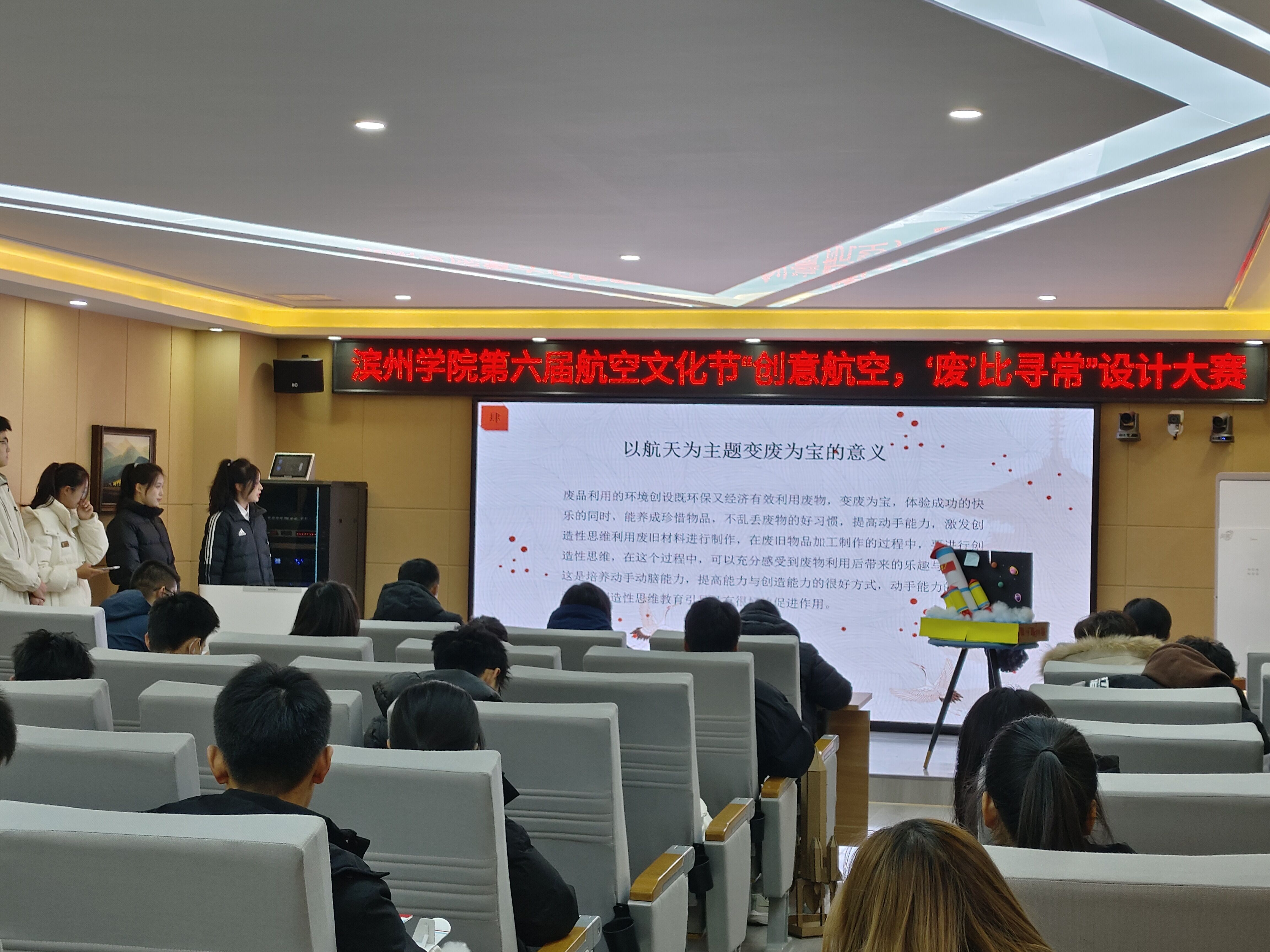 为进一步加强航空文化内涵建设,12月2日,滨州学院在实验中心孵化基地114路演室举办了第六届航空文化节“创意航空,‘废’比寻常”设计大赛。此次大赛由共青团滨州学院团委主办,生物与环境工程学院承办,来自11各学院的23支队伍参加了决赛答辩。